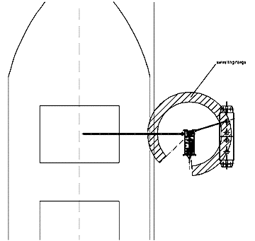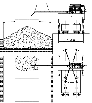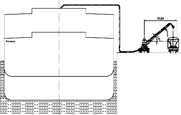 З цього малюнка, видно, що установка забезпечує розвантаження одного вагона, без його переміщення. Дана схема пневмотранспортера дає можливість обробляти транспортні засоби на значній відстані від судна. Однак необхідно передбачити механізм компенсації осідання судна — у міру його завантаження вертикальний канал має скорочуватися.