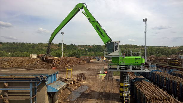 "Більшість перевантажувальних робіт на заводі здійснюється двома стаціонарними перевантажувачами SENNEBOGEN 835. Решту операцій виконує 735-й перевантажувач, він переміщує сировину по деревообробній ділянці. Концепція перевантажувачів "Pick and carry" вражає своєю маневреністю у вузьких проїздах. Максимальний виліт стріли становить 11,3 м, об'єм грейфера – 3 м3 ", – розповідає пан Войнар. Для розвантаження вантажівок застосовуються два перевантажувачі 825 моделі.