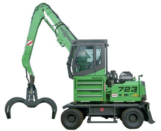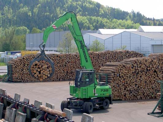 Нове покоління SENNEBOGEN для деревообробної промисловості має зміцненну ззаду стрілу. Таке розташування забезпечує оптимальний розподіл ваги, як у положенні ходу, так і під час проведення операцій підйому та переміщення вантажів. Наступною перевагою є повний огляд вправо, що не тільки додає безпеки, але й полегшує маневрування в тісних майданчиках зберігання. Іншою новинкою є стабілізатори ходу на стрілі, які раніше застосовувалися, лише на колісних навантажувачах і телескопічних стрілах. Вони забезпечують більш приємний та м’який хід, особливо при переміщенні вантажів. Привід ходу для важких умов, що має два ходові двигуни, створює запас потужності для забезпечення поворотної обробки. Тому механізм має добрі величини прискорень. Швидкість ходу, може, досягати 20 км/год до перемикання передачі. Дуже малий радіус повороту й радіус огинання заднього борту перетворює роботу в найтісніших умовах на дитячу гру. Шляхом оптимізації кінематики було досягнуто високих показників вантажопідйомності та навантаження. Результатом цього є малий робочий виліт із потенціалом значної зони досяжності разом із дуже великими вантажами. Цей, особливо, потужний привід забезпечує потужну, швидку роботу грейфера площею 3.2 м2, що дає можливість обробляти велику кількість лісоматеріалів. Машина має керований поворот при максимальному діапазоні навантаження. Автоматичне реверсування кермового управління встановлюється, як стандартна комплектація з метою забезпечення безпечного та зручного керування. У важких ситуаціях автоматично активується відпускання/блокування осі повороту, наприклад, вісь блокується в межах критичного діапазону перекидання. Нова серія 700 машин SENNEBOGEN — значний крок у майбутнє деревообробної промисловості.