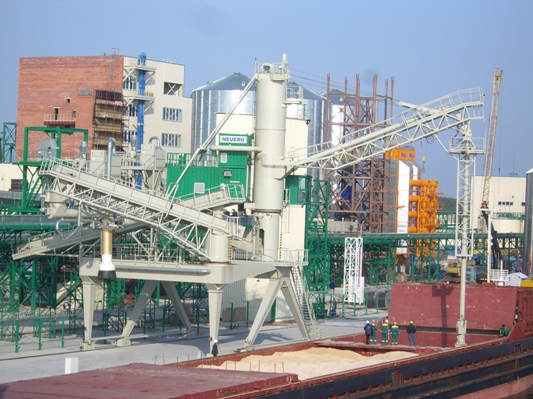 Подробнее ...Комбінована завантажувально-розвантажувальна машина NEUERO Combiflexiport, що працює на причалі в Калінінграді, має продуктивність 200 т/год при безперервному розвантаженні судна та 250 т/год при його завантаженні. Конструкція машини враховує специфіку вантажу (соєвого шроту) — оскільки він має тенденцію до злежування, всмоктувальне сопло було оснащено ротаційним живильником, що розпушує вантаж і подає його в зону всмоктування.